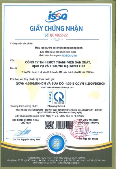 + Chứng nhận Phù hợp Quy chuẩn kỹ thuật quốc gia QCVN 4:2009/BKHCN cho máy lọc có chức năng nóng lạnh.