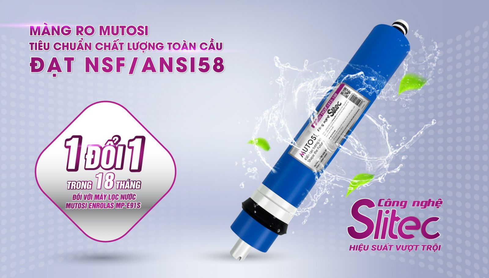• Sử dụng màng RO Mutosi – Công nghệ Slitec tiên tiến, đạt tiêu chuẩn NFS/ANSI 58 – Tiêu chuẩn toàn cầu cho màng lọc RO.